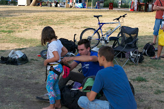 Giving out some shoes from the donation bag in Zemun. Sumsko and a promising little one making the best of a 41c day.
